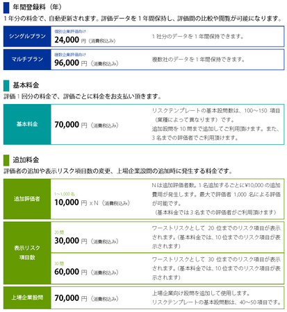 また、これらに加え、評価者の追加や表示リスク項目数の変更、上場企業設問の追加時に追加料金が発生します。詳細につきましては、下表をご覧ください。