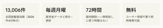 厚生労働省の公式データをもとに毎週更新。都道府県・条件での絞り込みに対応し、72時間の制限時間内に最寄りの薬局へたどり着けるよう設計されたサービス。