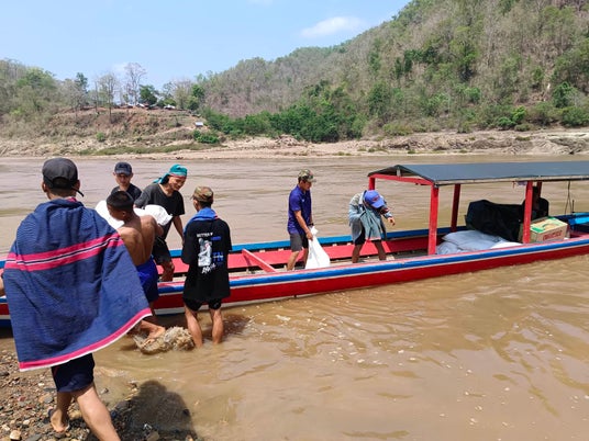 援助物資を小舟に積んで対岸のミャンマー側に届ける