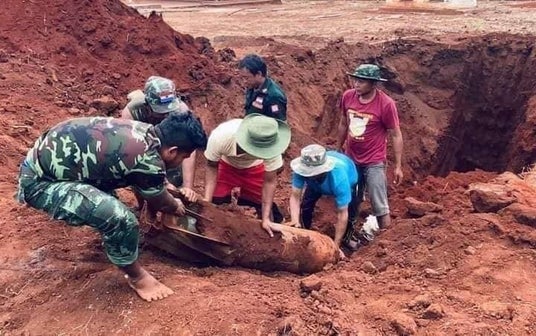 国軍の攻撃ののちに不発弾を掘り出す人々