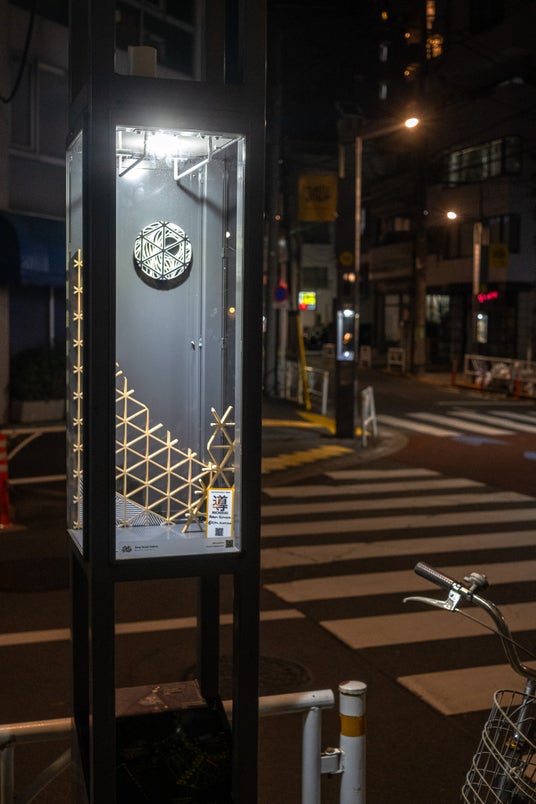 Jinny Street Galleryは、神宮前2丁目の中心部に位置する屋外アートギャラリーで、42個の小さな街路灯ケースが作品の展示スペースとなってます。街でアートを探索しながらそのエリアの散歩を楽しむ歩くことが、ギャラリーの主要コンセプトです。こちらの写真はこれまでの展示風景の一部です。