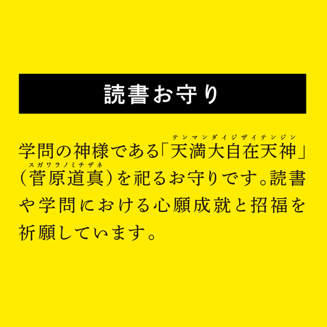 学問の神様である「天満大自在天神」(テンマンダイジザイテンジン)(菅原道真(スガワラノミチザネ))を祀るお守りです。読書や学問における心願成就と招福を祈願しています。