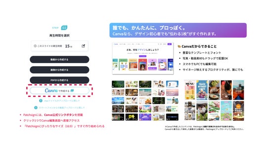 さらに、Patchsign上からワンクリックでCanvaを開ける公式連携ボタンも搭載。デザイン初心者でも、サイネージ映えするビジュアルをスマホひとつで制作可能です。