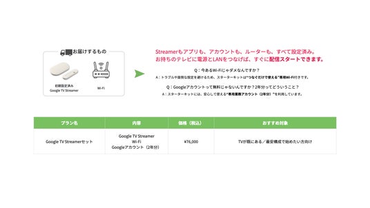 テレビやGoogle TV Streamer、Googleアカウント、Wi-Fiなどをすべて初期設定済みにしてお届け。