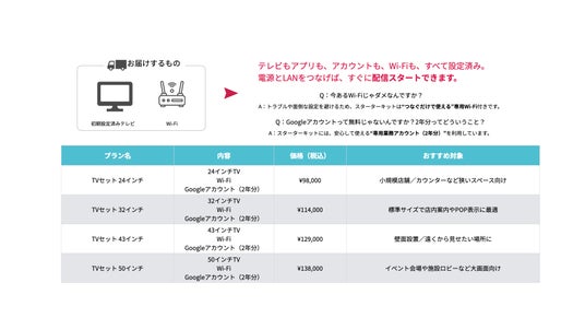 同時に、テレビや配信機器、Googleアカウントなどをすべて設定済みにした「スターターキット」の販売も開始。従来のサイネージが抱えていた「高コスト」「複雑な設定」「導入のハードルが高い」といった課題を根本から解決し、誰もが“伝えたいことを簡単に伝えられる社会”の実現を目指します。
