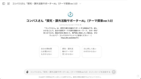探究・課外活動の相談AI「コンパスさん」は、そんな、業界として未だ課題の多い「テーマ設定」や「関心の発見・言語化」の支援に重点を置いています。AIとの対話を通じて、生徒自身の原体験や興味関心を深掘りし、オリジナルなテーマを見つける手助けをします。