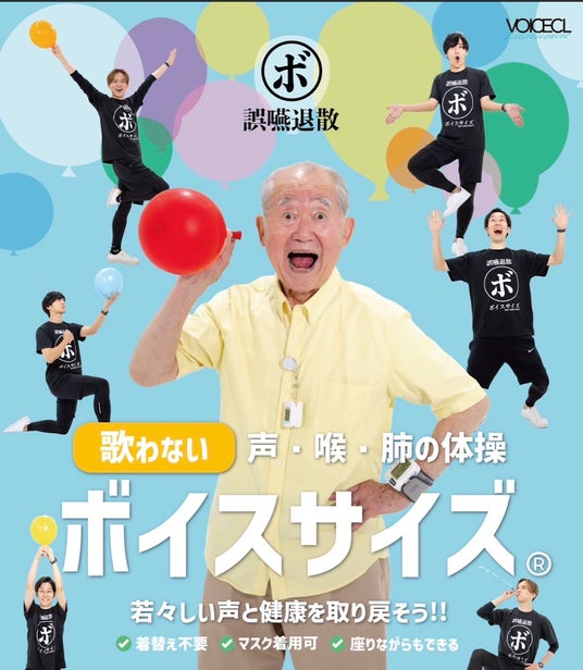声、喉、肺の"歌わない"発声エクササイズ、「ボイスサイズ」を開発。活動は、2019年から開始しております。死因第6位の「誤嚥性肺炎」の予防に特化し、音楽に合わせながら風船や吹き戻し等バライティに富んだ楽しい体操を行います。声や嚥下機能だけではなく呼吸法、体幹、舌なども鍛えるため、転倒予防、認知症予防、そして必然的にカラオケまで上手くなると、沢山の方々からお声を頂いているエクササイズです。