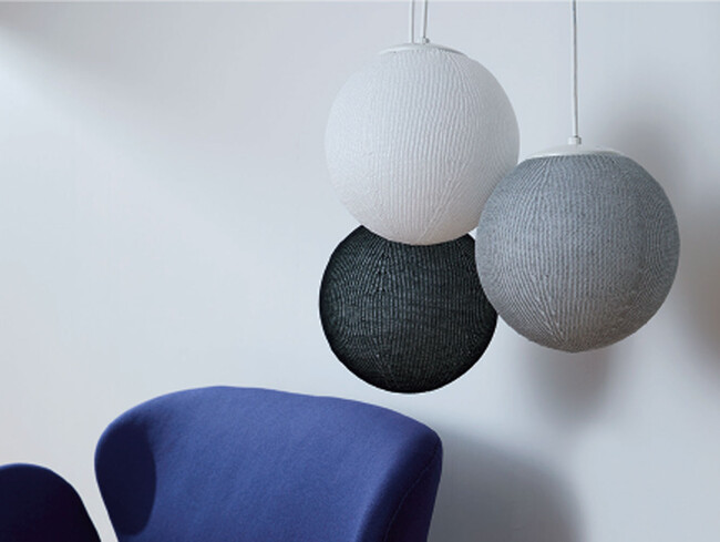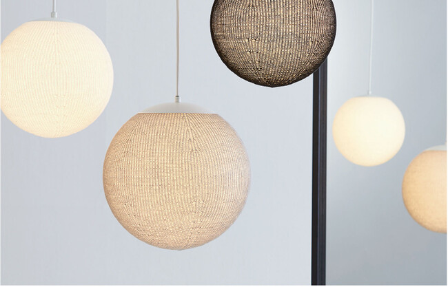 無縫製で編み上げる日本発の最先端技術「ホールガーメント」の技術を使って生まれました。1本の糸で3D(立体)球体を編み、柔らかなニットの編み地と照明の光が木漏れ日のような明かりを演出します。