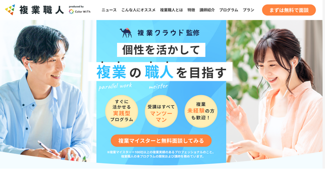 Color WiTh株式会社(本社:東京都中央区、代表取締役:若色広大、高橋範慈)は、代表の若色・高橋の全国100社以上の複業実績をもとに開発した独自プログラム『複業職人』を2023年9月4日(月)にリリースします。同事業は、複業したい個人と企業や自治体を繋ぐ日本最大級の総合型複業マッチングプラットフォーム「複業クラウド」を運営している株式会社Another works(所在地:東京都港区、代表取締役:大林尚朝)に監修いただきました。