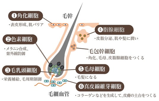 6種類の細胞が育毛に関与頭皮・毛髪の形成には6種類の細胞が関与しています。