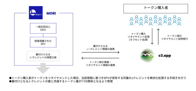 以下の手続きでJクレジットを裏付けとしたC3との協業の下、MORIがJ-クレジットのカストディの役割を果たしながら、トークンの発行及び流通、並びに裏付けとなるJ-クレジットの管理を進めてまいります。
