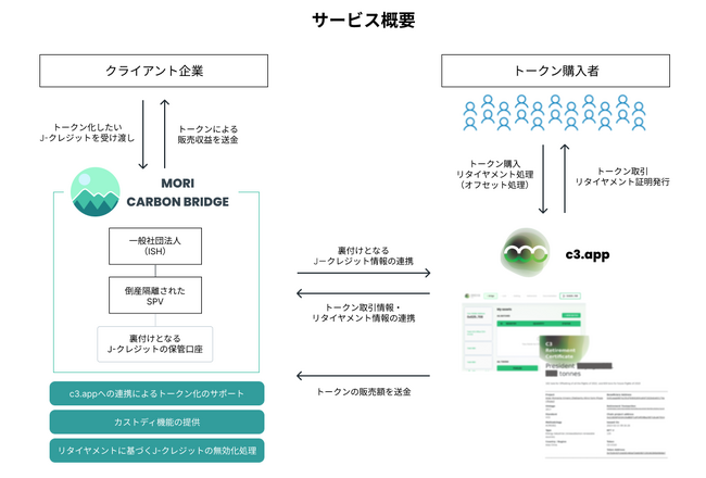 MORI(運営主体:JE FOREST株式会社 代表取締役 橋村純)は、ボランタリークレジット等のオンチェーンブリッジングプラットフォームを提供するC3、カーボンクレジット×WEB3の分野をリードするKlimaDAOと提携し、J-クレジットのトークン化の実証を開始するとともにカーボンクレジットを保有する企業等へのトークン化サービスを開始いたします。