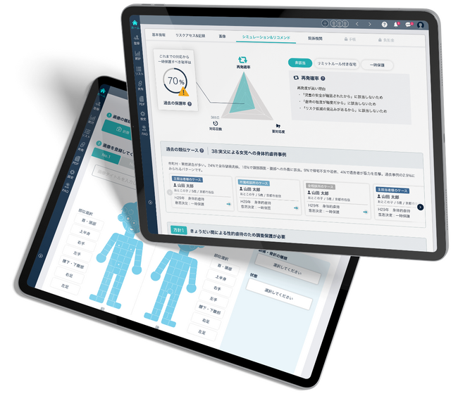 当社は現場の経験知と最新のテクノロジーを融合し、自治体の児童相談所や子育て支援課・母子保健課など、子ども虐待対応の最前線に立つ機関をサポートするサービスを開発・提供しています。