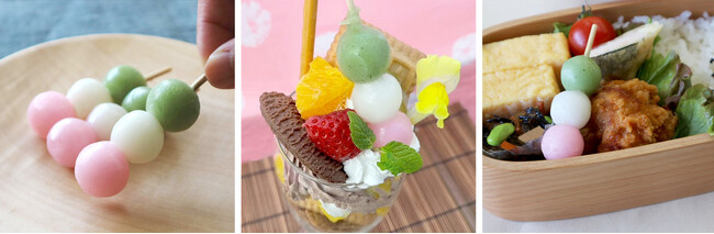解凍後、そのまま使える約8cm(串含む)のかわいらしいサイズの団子です。ピンク、白、緑の三色で、緑はよもぎを使っており、小さいけれど本格的な逸品です。会席では前菜や甘味として使え、お弁当のデザートとしても需要があります。パフェなどにトッピングすれば差別化商品が完成します。