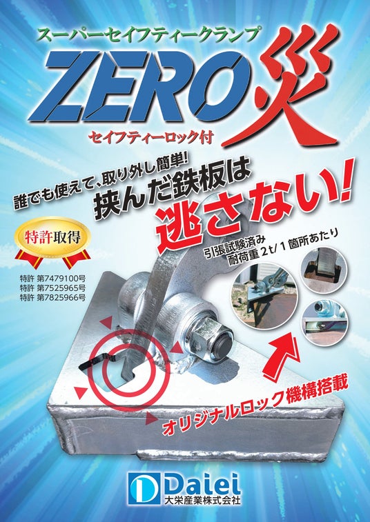 大栄産業株式会社(本社:群馬県前橋市、代表取締役社長:戸塚和昭)は、この度、敷鉄板水平吊り専用クランプ工具「スーパーセイフティークランプZERO災」を独自に開発、特許(特許第7479100号他)を取得し、2025年6月2日(月)より販売を開始。敷鉄板吊り作業による労働災害の撲滅に貢献すべく、コーナー4点吊りを基本として安定性を向上、安全性に優れ、作業の効率化にも大きく期待される商品となっており、吊り作業時に必要なマスターリングからチェーン、ハイカップ、フックも全てセット販売とし、メーカー希望小売価格は318,000円(税別)。