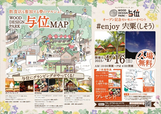 兵庫県宍粟市(しそうし)に出来たグランピング施設【ウッドデザインパーク与位】は2023年4月16日(日)にオープン記念イベントを開催致します。