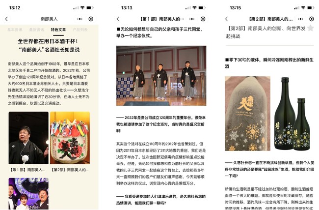 現在、「享受清酒」を活用している酒蔵は、現在58か国に輸出する南部美人(岩手県)、滝澤酒造(埼玉県)など13社。お薦め銘柄は勿論、酒造りへの想いや理念、ストーリー、インタビューなど“生の声”を届ける、各蔵の「中国向け公式サイト」としてファン獲得に向けた情報発信を行なっています。