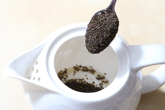2.温めていたティーポットに茶葉を入れる。基本は人数分+1杯だが、ミルクティーにするために茶葉を多めに入れる。