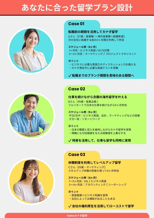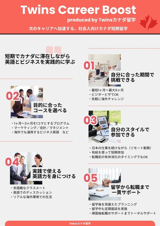 Twinsカナダ留学(運営会社:TWIN WOODS HUMAN RESOURCE CORP、代表:森 尚樹)は、2026年4月より社会人向け新プログラム「Twins Career Boost(ツインズ キャリアブースト)」を開始しました。