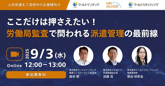 株式会社ワールドインテック×株式会社HRガイド×株式会社ワールドスタッフィングの3社共催ウェビナーを開催致します。