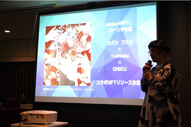 (写真)正式ローンチ時にリリースされる "カズシ フジイ×Yoshioka×ONIKU コラボNFT" の発表をするカズシ フジイ氏