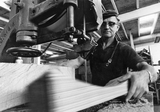 椅子パーツをバンドソーでカットする様子のアーカイブ画像。椅子やテーブルのそれぞれの部位に適した木目や色合いを実現する為にこの伝統的な手法が今も受け継がれています。
