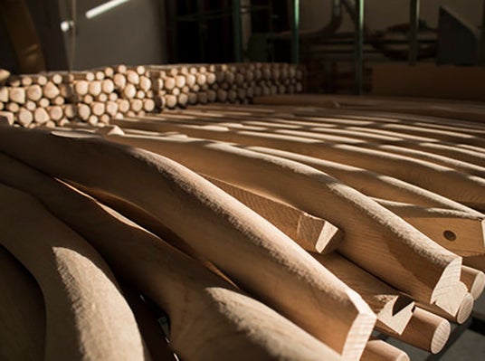 J.L.モラーは70年代初頭にニールス O. モラーが最初に導入したのと同じ老朽化したCNCマシン(コンピューター数値制御機械)を使用しているだけでなく、現在でも1960年代と同じ製材所から木材を調達しています。すなわち、オーク材は南ドイツのシュペッサートから、メープル材はベルギーから、ビーチ材はデンマークから、チーク材はゆっくりと成長するビルマ産のもので、ウォールナット材はアメリカから輸入された厳選された原木を、木材輸入業者がデンマークでサイズに合わせてカットしたものです。「私たちは工場から南へ数時間行ったところにあるデンマークの丸太輸入業者の所に行きます。」とキーステン・モラーは言います。「そして私たちのニーズに最も適したものを選びます。家具を作るために適切な木材を選ぶ技術は非常に過小評価されていますが、これは極めて重要です。実際、それは科学なのです。」