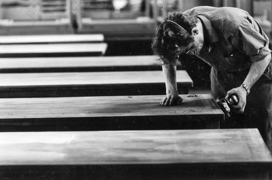 研磨中のテーブルのアーカイブ画像。手作業による仕上げは、今日に至るまでプロセスの重要な部分であり続けています。