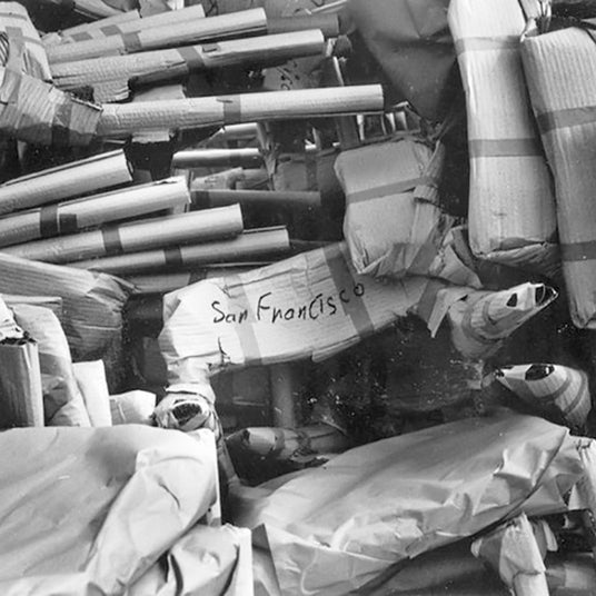 サンフランシスコに配送されるJ.L.モラーチェアが梱包されているアーカイブ画像
