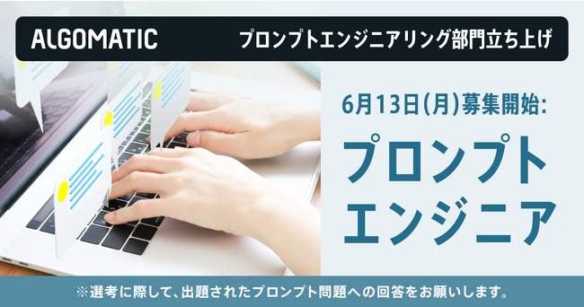 大規模言語モデル等生成AI技術を活用した、サービスの開発・提供を手掛ける株式会社Algomatic(本社:東京都港区、代表取締役社長:大野峻典、以下Algomatic)は、プロンプトエンジニアリング部門を新設し、プロンプトエンジニア職の募集を2023年6月13日(火)より開始しました。