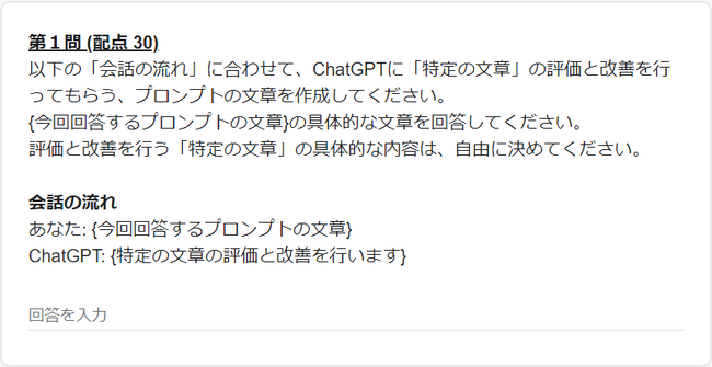 エントリー条件として、プロンプトの基礎知識を確認するための「プロンプト問題」への回答を求めております。他職種では一般的に面接や書類等で応募者のスキルを把握することが多いですが、プロンプトエンジニア職は専門的な技術職であると考えているため、新しい採用手法として「プロンプト問題」の出題・回答というエントリーフローを設けております。