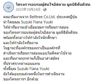 引用:フィアナ先生をリーダーとする「株式会社Bell tree」は、イスラム学校を訪れ学生たちと交流しました。その際、フィアナ先生は運営団体に寄付を行っています。(運営団体のFacebookより、一部抜粋して翻訳)