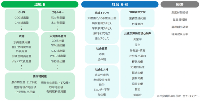 「aiESG」は、世界初となる製品およびサービスレベルの包括的なESG分析を可能とするサービスです。当社保有のESGサプライチェーンビッグデータを用いたAI分析により、3200余りのESG指標について詳細な試算が可能であるだけでなく、業界平均・従来品等との比較が可能です。特に、CO2などの環境面だけでなく、近年重要性が増している人権、生物多様性、労働環境等を含めた社会面やガバナンス面を定量的に評価可能な点において世界初のソリューションとなります。