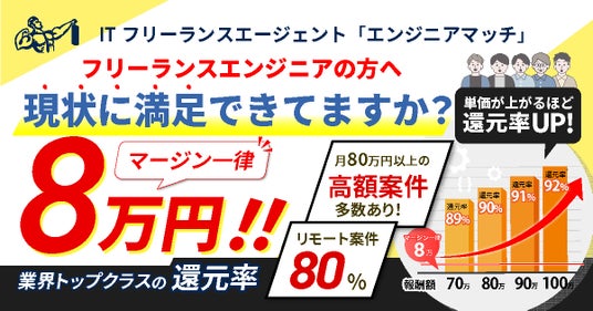 ヘルシーテック株式会社(本社:東京都豊島区 代表:藤本将平)がITフリーランスエージェントの”エンジニアマッチ”の提供を開始したことをお知らせいたします。全案件のマージンを一律8万円とすることで、業界で度々発生するクライアント-技術者間の不均衡の解消・技術者への正当な還元の実現を目指しています。