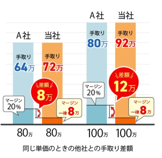 業界のマージン(仲介手数料)は15~40%と言われていますが、当サービスではマージンを一律8万円で統一しています。