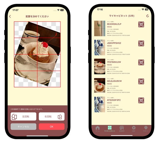 アプリで出来上がりサイズを選び、画像のレイアウトを調整してプリントデータを作成することで、アプリのマイキャビネットにプリントデータとそれに紐づくプリントNo.およびQRコードが保存されます。