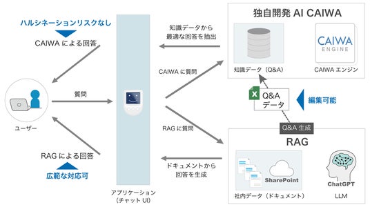 さらに、ハルシネーションリスクがないCAIWAの応答と広範な対応が強みの生成AI(RAG)による応答の両方をシームレスに取得し比較できたり、生成元表示によるファクトチェックができたりと誤情報の取得を回避するための仕組みが整っています。