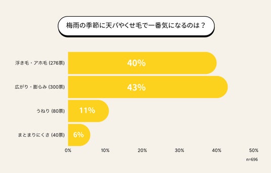 今回実施したアンケート調査によると、ほとんどの方が梅雨時に髪の悩みを抱えていることが明らかになりました。多くの方が梅雨の湿気でくせ毛や天パが広がると感じていることようです。