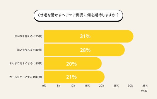 また、くせ毛を活かすヘアケア商品に対して、多くの方が広がりを抑えることを期待しており、次いで潤いを与えることやカールのキープが求められています。これらの結果は、くせ毛を活かしつつ、湿気による広がりや乾燥を防ぐヘアケア商品の必要性を強調しています。
