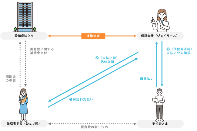 ジェイリースの養育費保証サービス「J-みらい」により、養育費未払い時にジェイリースが養育費受取者さまに代位弁済を行います。知立市の養育費に関する補助金交付制度(保証契約時保証料補助、公正証書等作成費用補助)と併せて、ひとり親家庭の養育費の確保等について包括的な支援を行います。