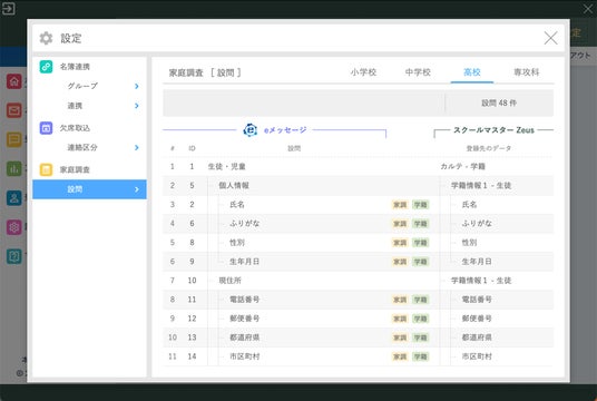 シングルサインオン連携により『eメッセージ』の一斉配信、確認を、スクールマスターZeusの画面内で操作、確認することができます。また、通常の一斉配信だけでなく「出欠連絡の確認」や「校務システムへの情報取り込み」「家庭調査票の案内・確認」をかんたんなボタン操作のみで行うことが可能です。