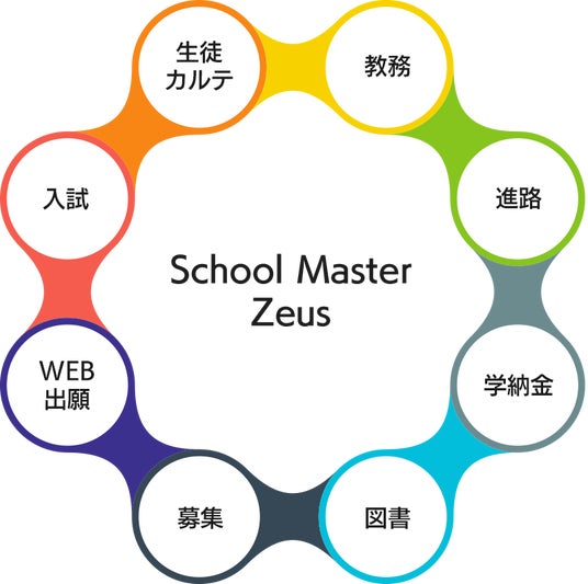スクールマスターZeusは、通知表、要録、調査書、進路指導等の煩雑な事務作業から先生を解放して理想の学校づくりを実現するトータル校務支援システムです。簡単操作で、PCに不慣れでも扱いやすいデザインが特徴です。全国の私立小学校、中学校、高等学校様にご利用されています。