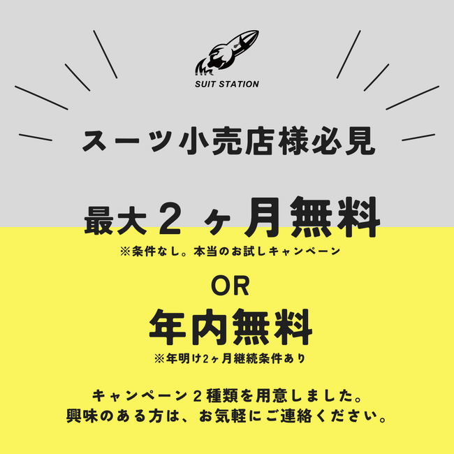 「SUIT STATION」広告プランに申込をご検討されている小売店様向けに、以下2種類のキャンペーンをご用意しております。