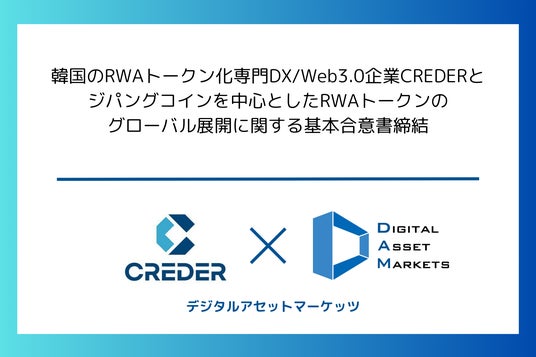 株式会社デジタルアセットマーケッツ(本社:東京都千代田区、代表取締役:西本一也、以下「デジタルアセットマーケッツ」)は、韓国においてRWAトークン化を専門とするDX/Web3.0企業CREDER Inc.(本社:韓国 ソウル、CEO:James Im、以下「CREDER」)と基本合意書を締結したことをお知らせします。本合意書により、当社が発行支援するジパングコイン(三井物産デジタルコモディティーズ株式会社が発行)を中心としたRWAトークンのグローバル展開を推進します。