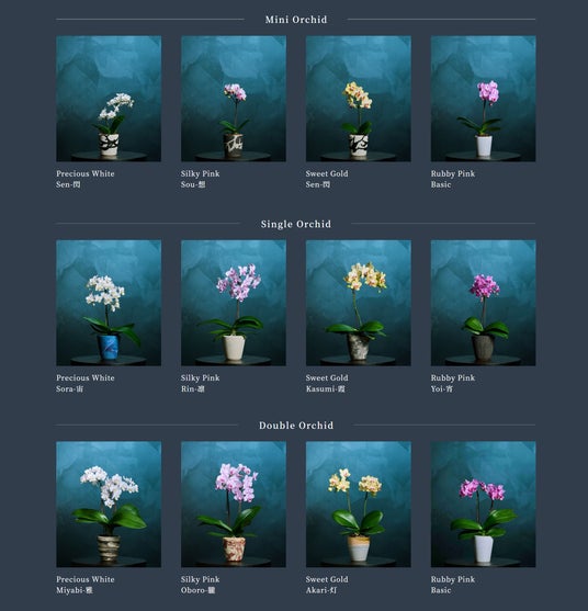 【サイズ】Mini Orchid / Single Orchid / Double Orchid(3種)・【カラーバリエーション】Precious White / Silky Pink / Sweet Gold / Rubby Pink【フラワーポット】Mini Orchid 専用(2種) Single & Double Orchid 専用(7種)