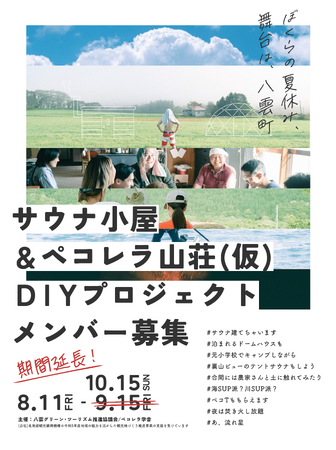 八雲グリーン・ツーリズム推進協議会(本部:北海道八雲町、代表:黒島 竹満)と株式会社木蓮(本社:北海道八雲町、代表:近藤 安幸)が運営する廃校活用施設「ペコレラ学舎」で実施中のサウナ小屋&宿泊棟DIYプロジェクトのボランティア募集期間を2023年10月15日まで延長します。