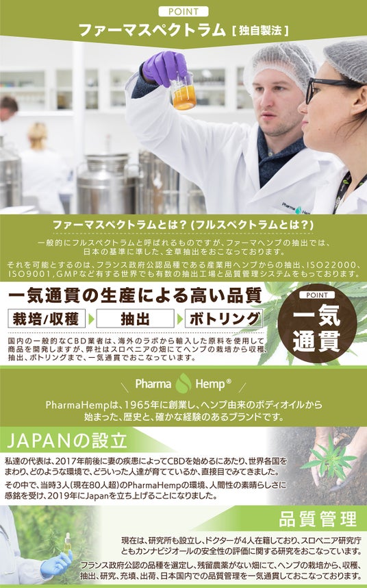 オイルなどにCBDアイソレートやCBNアイソレートをブレンドし、ブロードスペクトラムとするのではなく、超臨界CO2抽出で生搾りされたエキスを、独自の製法にて、THCを基準値以下に調整しました。また、最終製品のTHC検査、残留農薬・重金属・微生物など多項目の検査をクリアし、安心かつ安全な製品を実現しました。弊社の商品は、フルスペクトラムでもなく、ブロードスペクトラムでもなく、「ファーマスペクトラム」です。