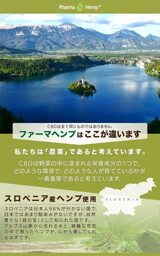 1965年、スロベニアで「緑の宝」と呼ばれるヘンプ由来ボディオイルの製造からスタートしたPharmaHemp。2019年に日本法人を設立し、現地Ph.Dらと連携しながら、正しいCBDの知識を日本市場に発信しています。