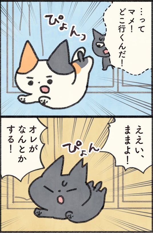 飼い主が突然帰って来なくなったマメとクロは、家の外へ飛び出し飼い主を探し始めます。