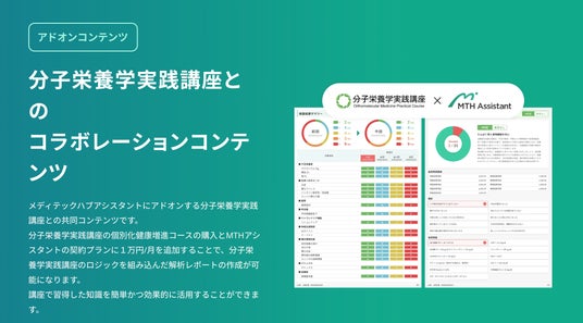 この取り組みの一環として、当社が提供する医療支援ツール「メディテックハブアシスタント」に、分子栄養学実践講座のロジックを組み込んだ新機能を追加。これにより、学んだ知識を活かした個別化レポートの作成が可能となり、医療従事者が効率的かつ高品質な栄養療法を実践できる環境を整えます。今後も宮澤氏の専門的知見を活かし、より多くの医療機関や受講生にとって有用なプラットフォームの構築を目指してまいります。
